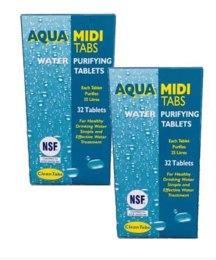 Aqua Midi Tabs 32 Tablets are specifically formulated for maximum microbiological control in stored water, and will keep water fresh when used. Midi Tabs will kill bacteria, spores, cysts, algae, fungi, protozoa and viruses, and are especially lethal to Entamoeba histolytica. Causative water-borne organisms including Salmonella typhi, Vibria cholerae, Shigella sonnei, Sterptocoecus faecallis, Estcherichia coli, amongst others, are also killed by Midi Tabs. Contains 32 tablets Each tablet purifies 25 litres of water Features Rapid dissolving effervescent tablets for treating stored water Tablets are foil wrapped to remain stable for 5 years or more The formulation contains dichloroisocyanurate, an organic chlorine donor with superior disinfection capacity Manufactured to strict specifications to ensure an accurate dose Convenient, simple-to-use method of purifying stored water.