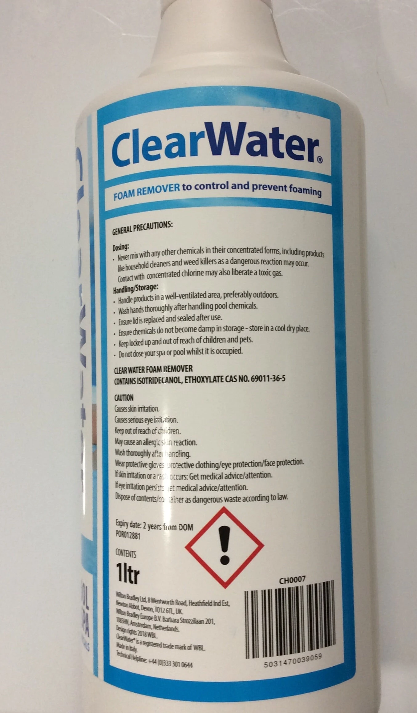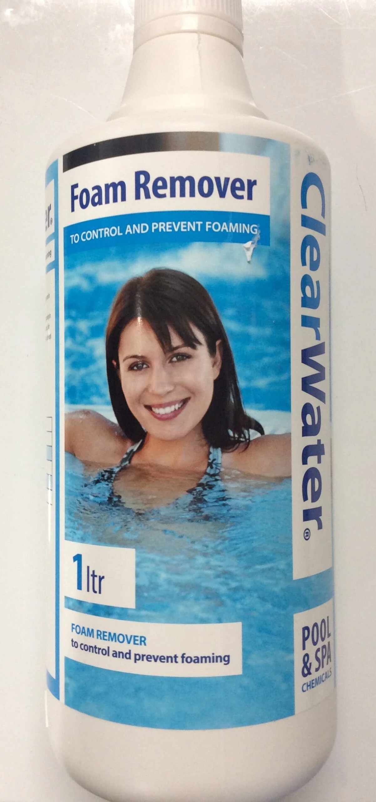 Clearwater foam remover 1litre bottle that helps control the problem of foaming in pools