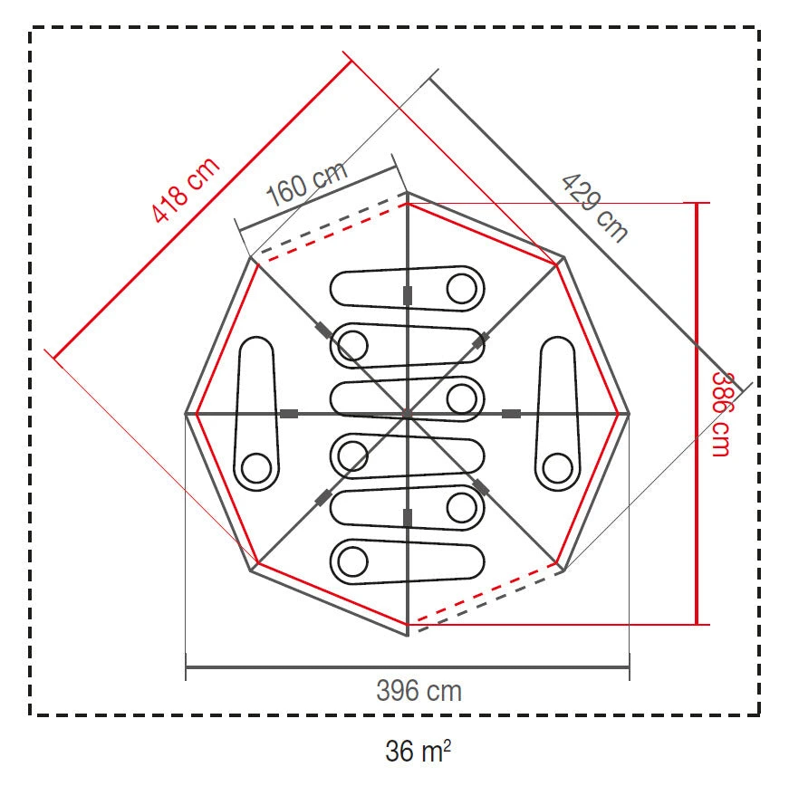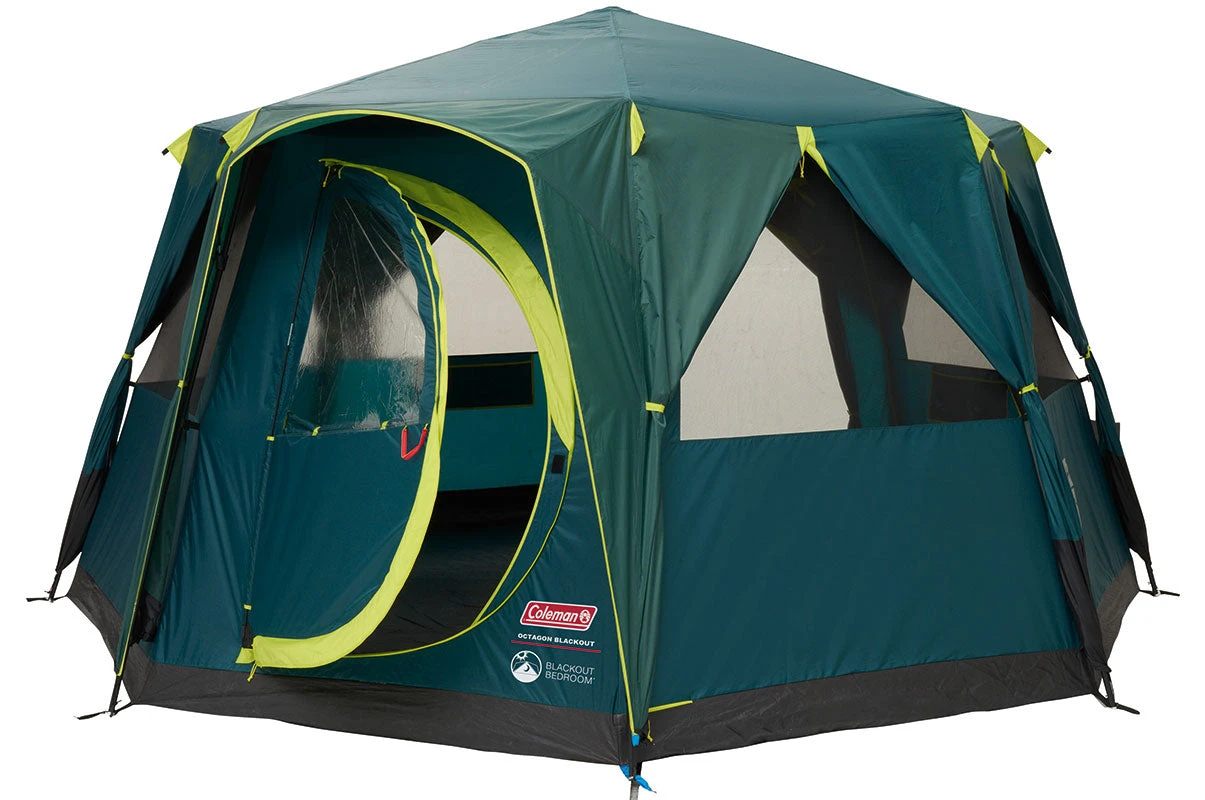This Coleman Octagon has tons of inside space and is capable of sleeping up to 8 people. This tent features Coleman’s BlackOut Bedrooms, full head height throughout with a unique shaped design. The Octagon offers a full 360° view of your surroundings thanks to windows all round. Six of the eight sides open up completely, allowing lots of air and light into the tent. The two remaining panels feature a doorway with the patented Coleman Hinge Door that functions like an actual door, swinging open and shut. The flysheet can be removed and the Octagon transforms into a bug-proof screen room perfect for the garden.