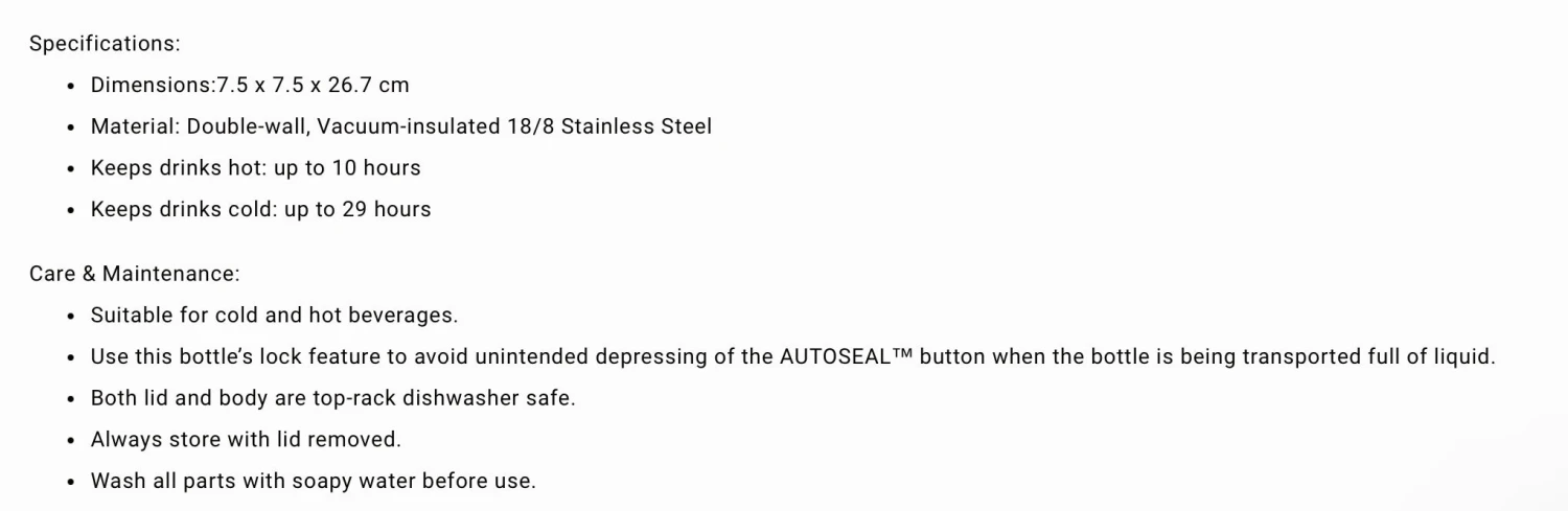 - THERMALOCK⢠double-wall, vacuum- insulation keeps drinks hot up to 10 hours and up to 29 hours cold