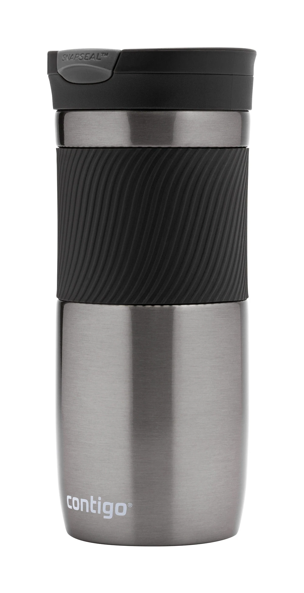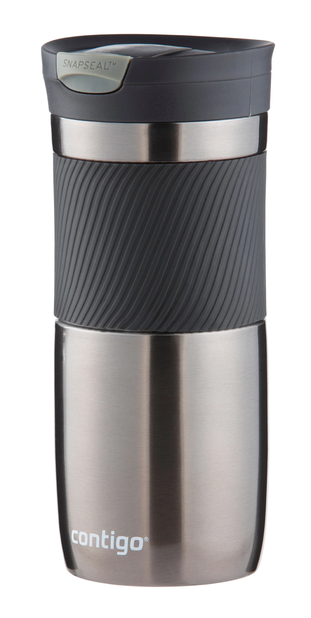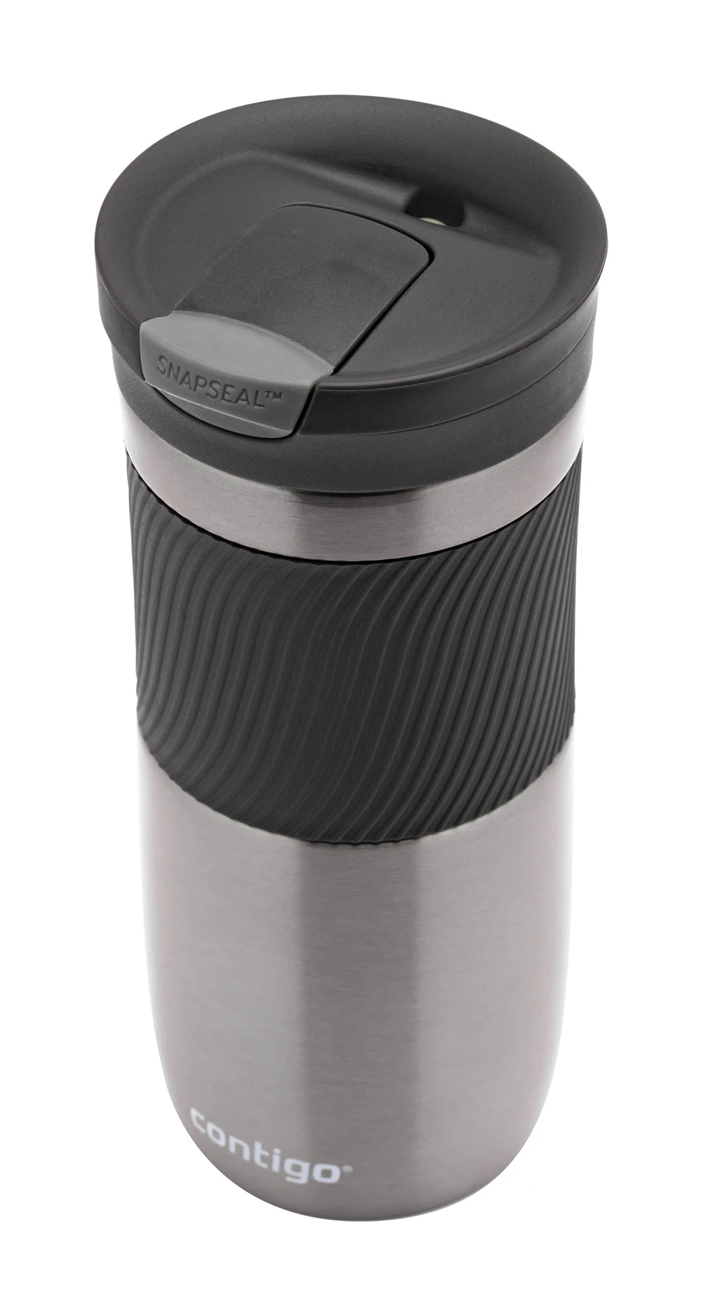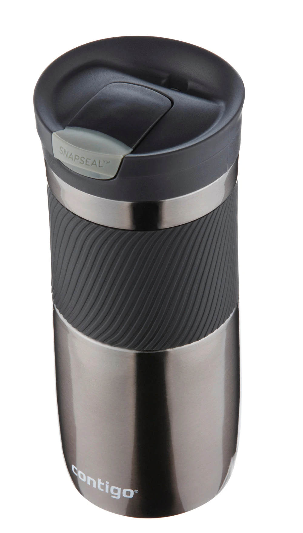 The Contigo Bryon SNAPSEAL™ Travel Mug seals for 100% leak-proof performance. The Contigo SNAPSEAL™ Travel Mug is designed for an easy, one-handed drinking experience. Pop the top to drink (there’s no lid to unscrew or remove) and then snap it closed after sipping to seal the leak-proof lid. Tea or coffee stays hot for up to 6 hours or cold for up to 12 thanks to THERMALOCK™ vacuum insulation. This mug is designed to fit in most car cupholders and features a stylish grip to easily grab and go. This stainless-steel travel mug has a top rack dishwasher-safe lid and the body is hand-wash only.