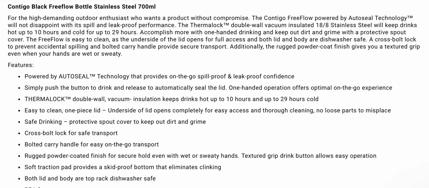For the high-demanding outdoor enthusiast who wants a product without compromise. The Contigo FreeFlow powered by Autoseal Technologyâ„¢ will not disappoint with its spill and leak-proof performance. The Thermalockâ„¢ double-wall vacuum insulated 18/8 Stainless Steel will keep drinks hot up to 10 hours and cold for up to 29 hours. Accomplish more with one-handed drinking and keep out dirt and grime with a protective spout cover. The FreeFlow is easy to clean, as the underside of the lid opens for full access and both lid and body are dishwasher safe. A cross-bolt lock to prevent accidental spilling and bolted carry handle provide secure transport. Additionally, the rugged powder-coat finish gives you a textured grip even when your hands are wet or sweaty.