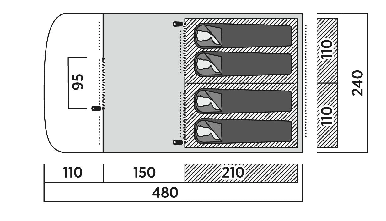 The Easy Camp Palmdale 400 is a great choice for growing families, couples or for just sharing with friends. The Palmdale sleeps four across two bedrooms and features colour coded poles and pole sleeves to make pitching fast and easy. A sewn in groundsheet cuts out draughts whilst large curtained windows in the living area let light flood in. The pre-attached canopy over the front door, with mesh insect screen, and windows offers extra shelter for access, cooking and storing bikes.