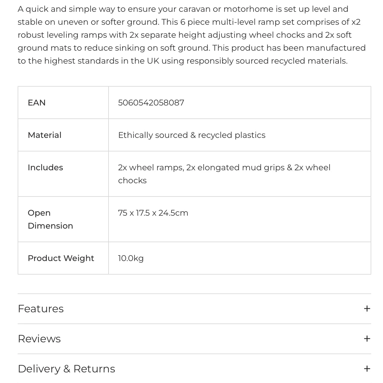 Outdoor revolution Eco combi ramp set, 6 piece multi ramp set for caravans and motorhomes. Max load weight is 2000kg.