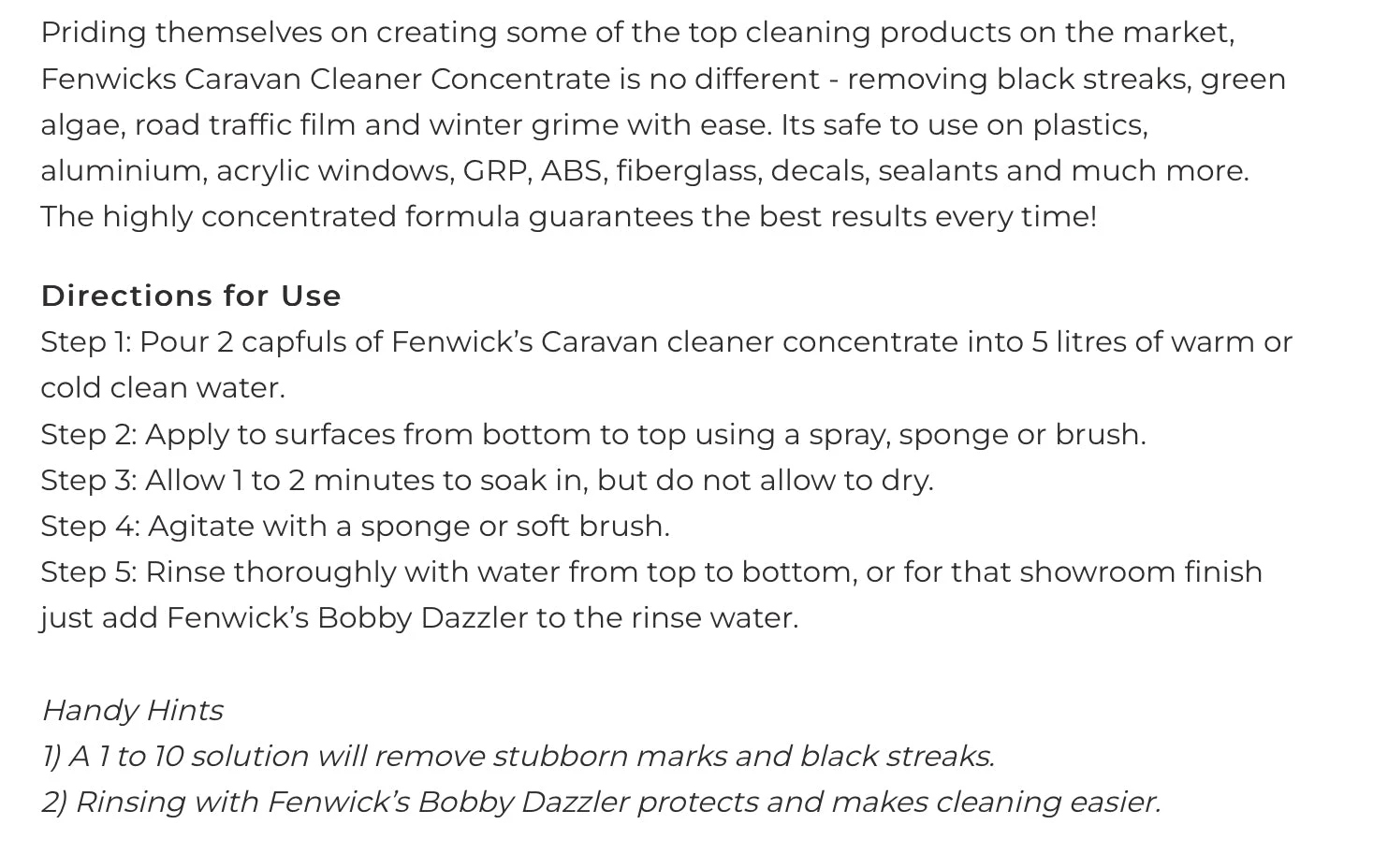 Fenwicks are a British company who have been producing some of the best cleaning products available today. Their products are made in the UK to the very highest of standards and surpass their rivals in performance and ease of use. Superior performance and proud to be made in the UK. Fenwicks caravan cleaner concentrate will easily remove black streaks green algae road traffic film diesel fumes and overwintering grime etc. It is suitable for cleaning plastics aluminium acrylic windows GRP ABS fibreglass decals sealants and much more. A highly concentrated formula guaranteed results! Up to 40 washes per easy-to-pour 1-litre bottle.