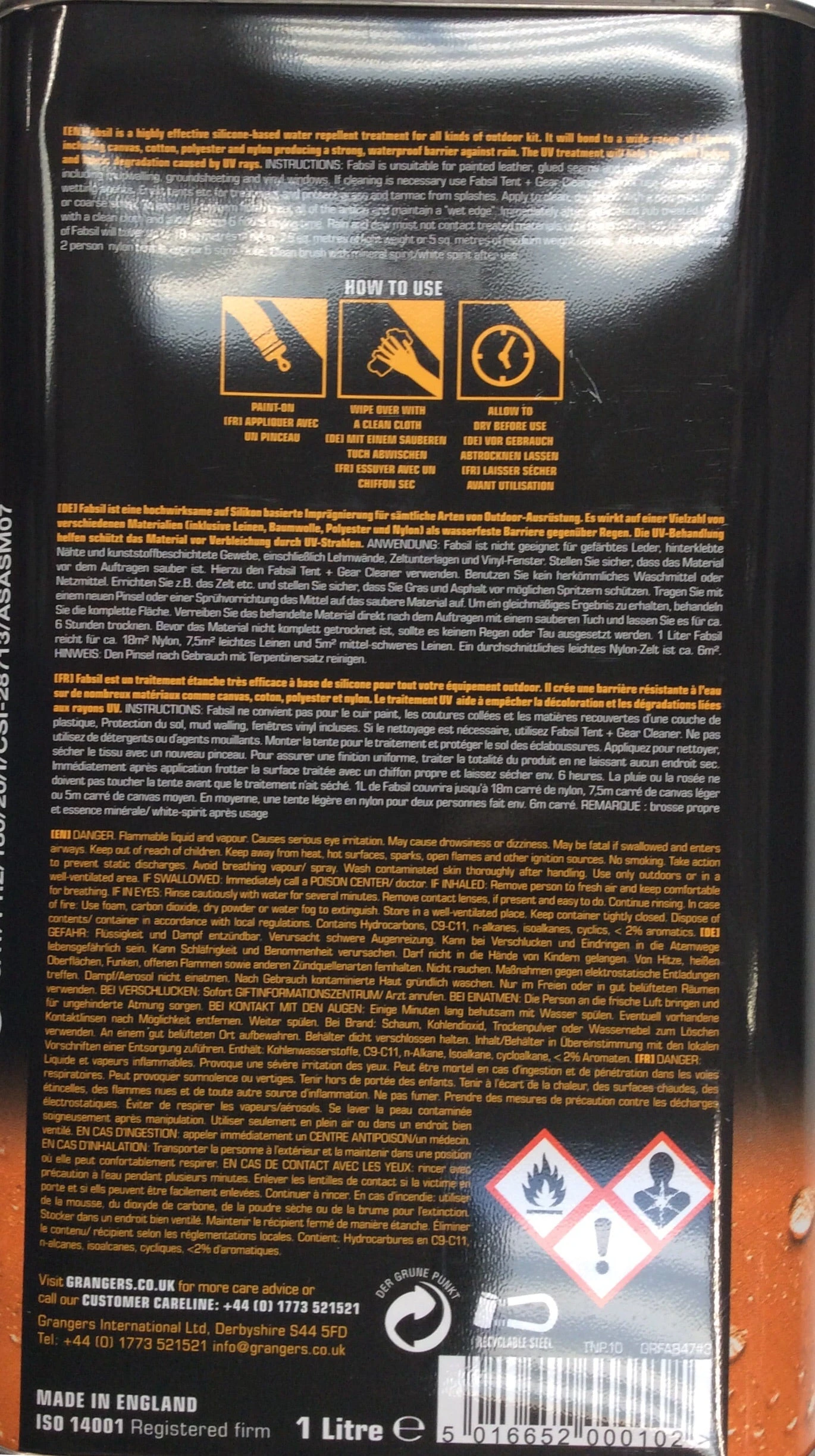 A Silicone based water repellent that now incorporates a unique UV absorber that protects the fabric against the sun. Fabsil also offers high water repellence and is colourless and odourless when dry.