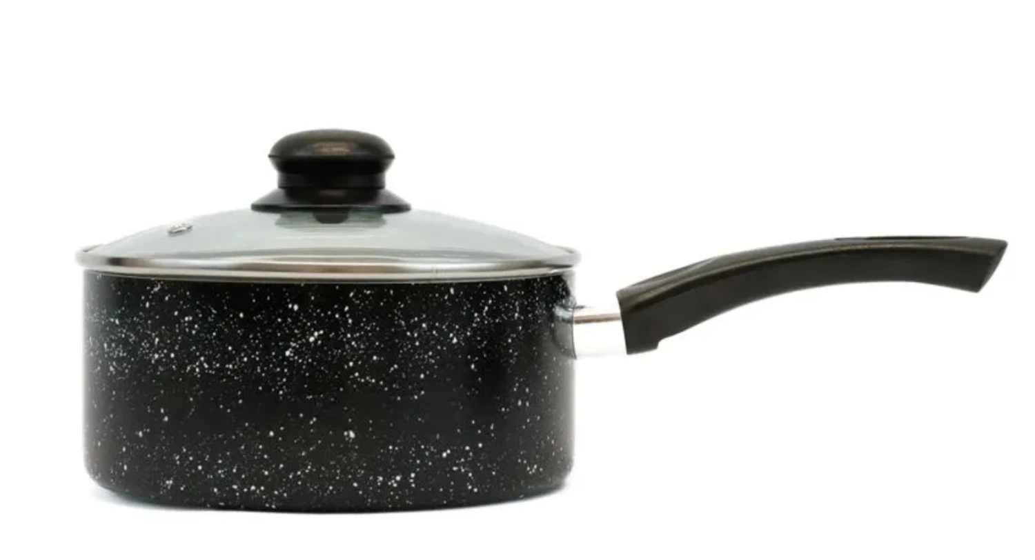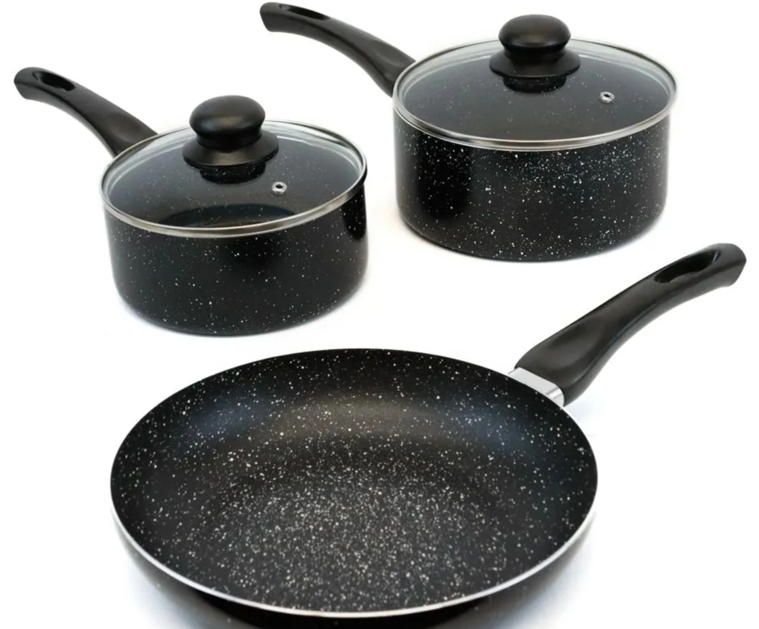 Each pan is made from high grade aluminium with a stainless steel base, making it suitable for use on induction hobs. It also features a non-stick marble coating inside the pan and a heat resistant lacquer on the outside. Finished with a bakelite (highly heat resistant) handle.