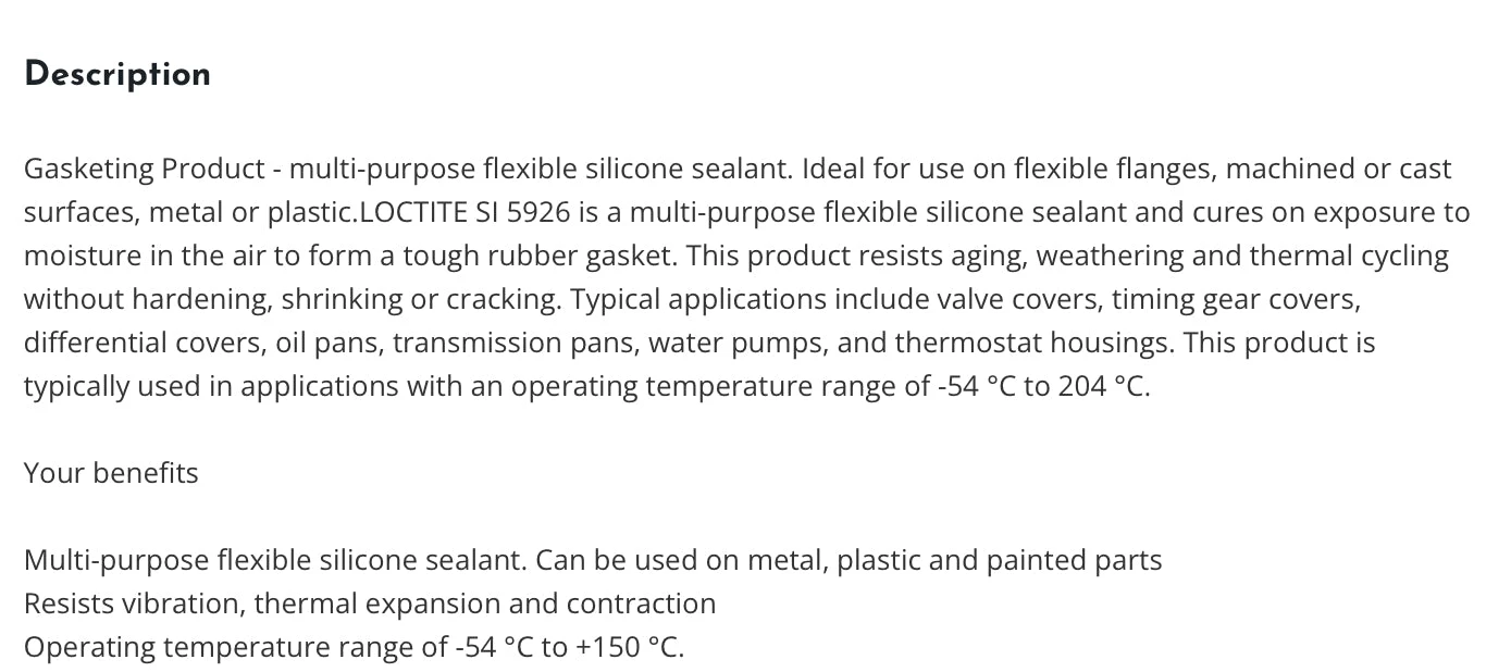 Gasketing Product – multi-purpose flexible silicone sealant. Ideal for use on flexible flanges, machined or cast surfaces, metal or plastic.LOCTITE SI 5926 is a multi-purpose flexible silicone sealant and cures on exposure to moisture in the air to form a tough rubber gasket. This product resists aging, weathering and thermal cycling without hardening, shrinking or cracking. Typical applications include valve covers, timing gear covers, differential covers, oil pans, transmission pans, water pumps, and thermostat housings. This product is typically used in applications with an operating temperature range of -54 °C to 204 °C.