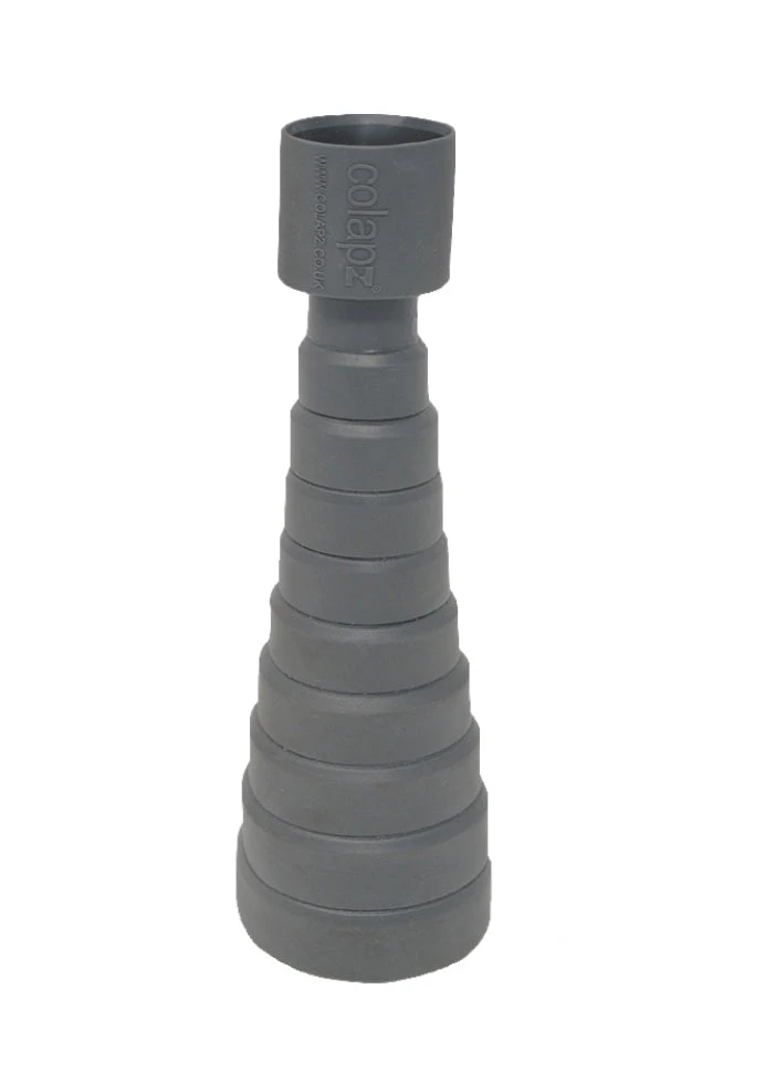The rubberised adaptor is very easy to cut to the required diameter of your waste water pipe, which then fits to the Colapz Flexi Waste kit. Easy to clean and store.
