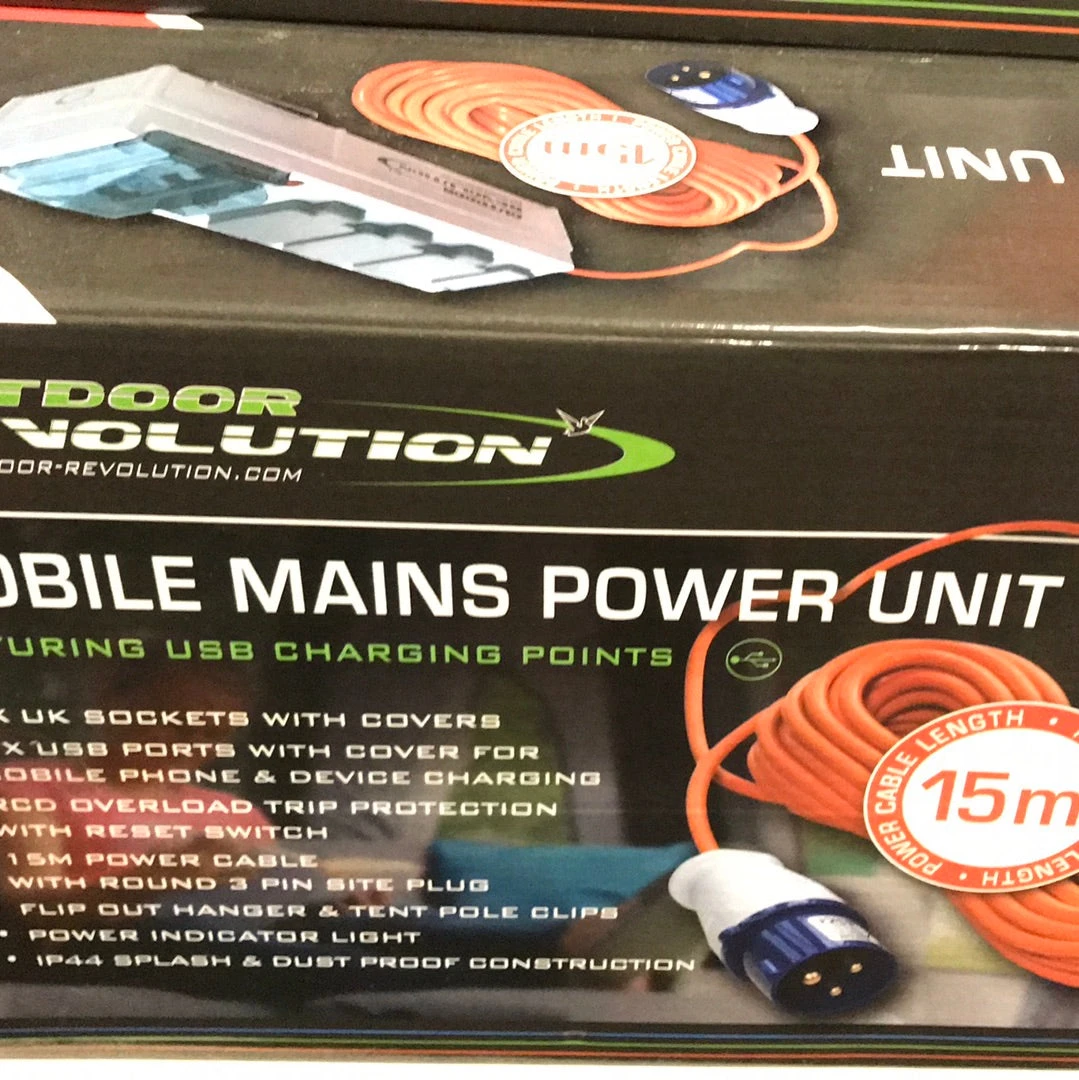 Outdoor Revolution Mobile mains power unit, with 2 built-in USB Ports is the perfect way of providing mains electricity into your tent/awning. Featuring 15 meters of waterproof cable and a splash-proof mains unit (that will be inside your tent/awning) 3 x UK sockets with RCD protection and 2 USB ports, it’s the perfect way of charging your phone/tablet or running your heater and toaster.