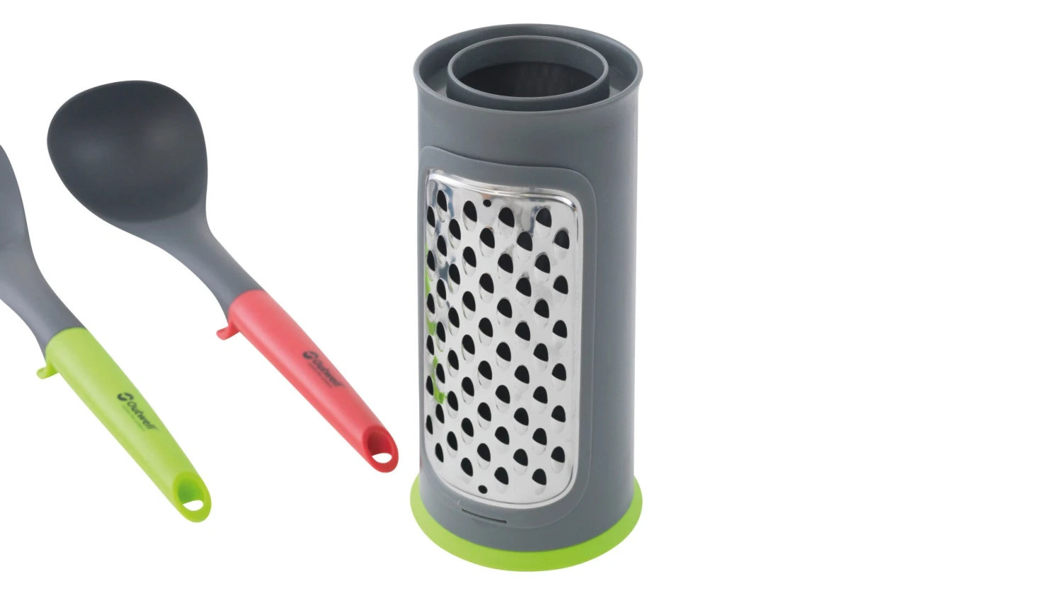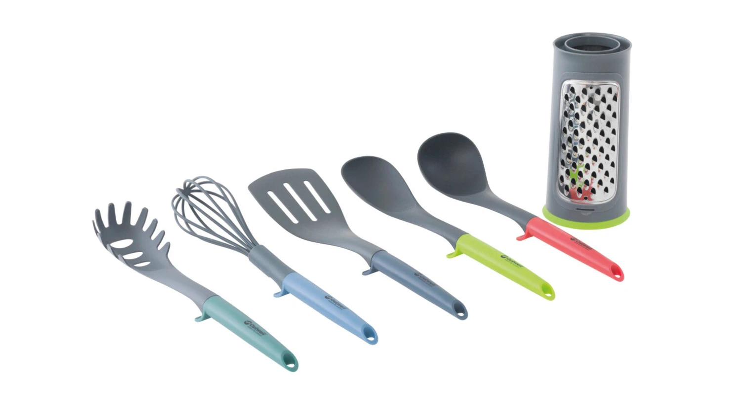 The Outwell Adana Set is a utensil set featuring easy-grip handles in bright colours and five cooking tools that hook on to a stable stand that can be used as a grater.