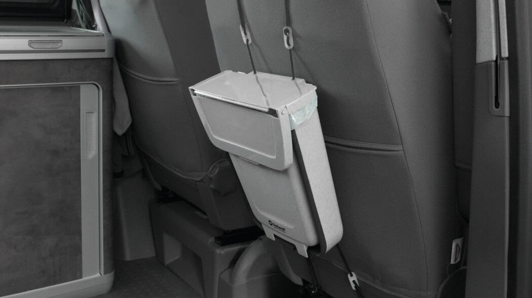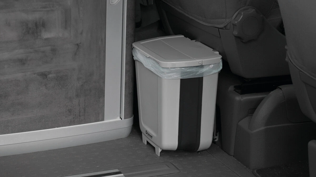 The Outwell Collaps VanTrash is a freestanding easy clean collapsible bin. It can be mounted to a campervan​ seat back. Lid and body size adjustable, standard bin bag compatible.