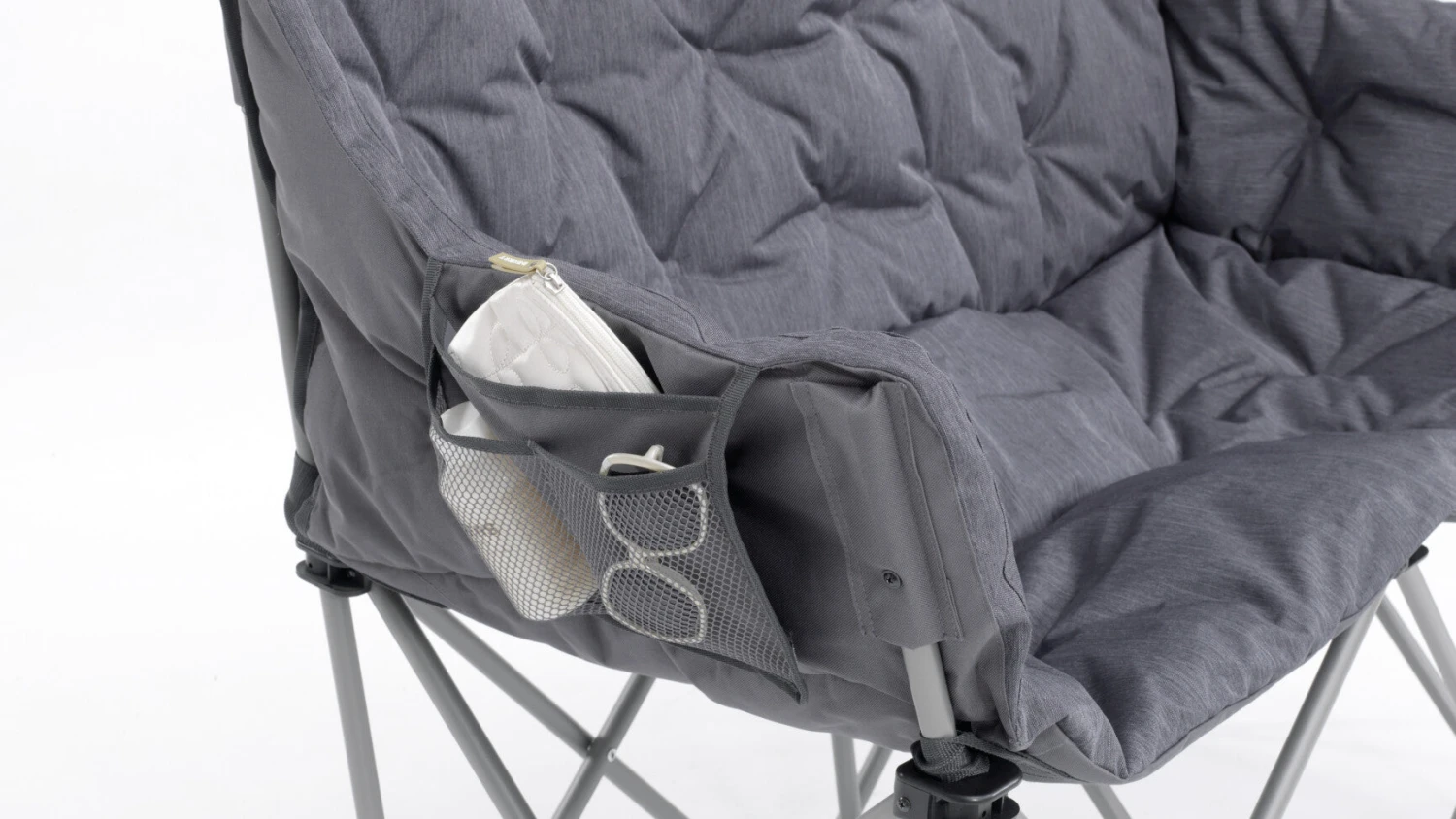 The Outwell Sardis Lake is a padded folding two seat sofa which you can also use as a double dining chair. It has a solid steel frame and soft cushioning, offering home comfort anywhere, while the pocket at the side provides handy storage.