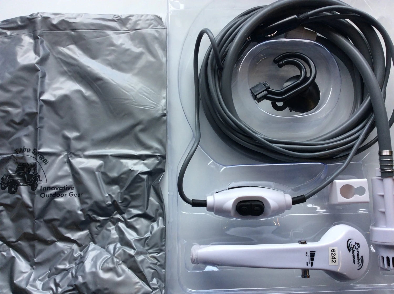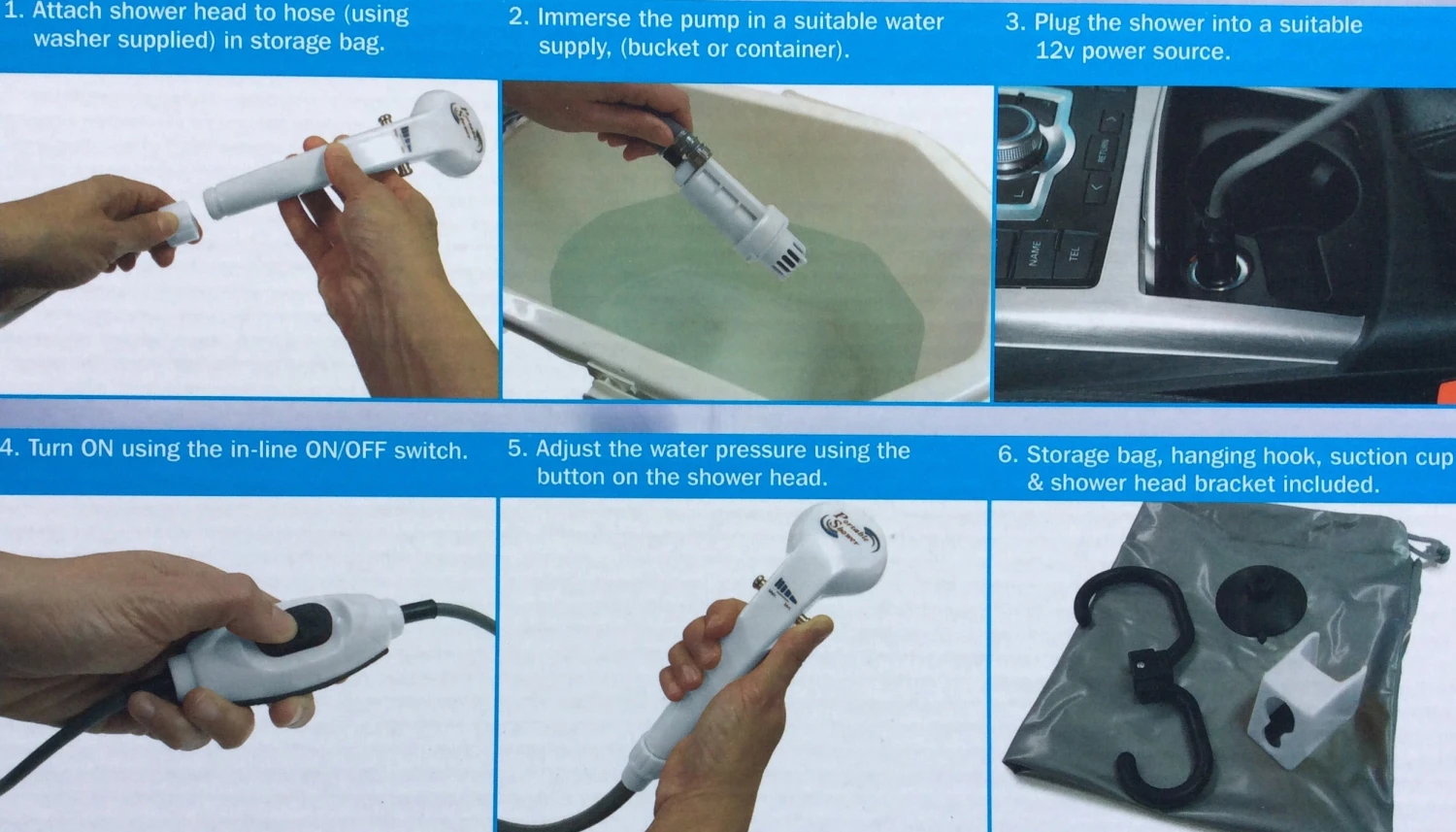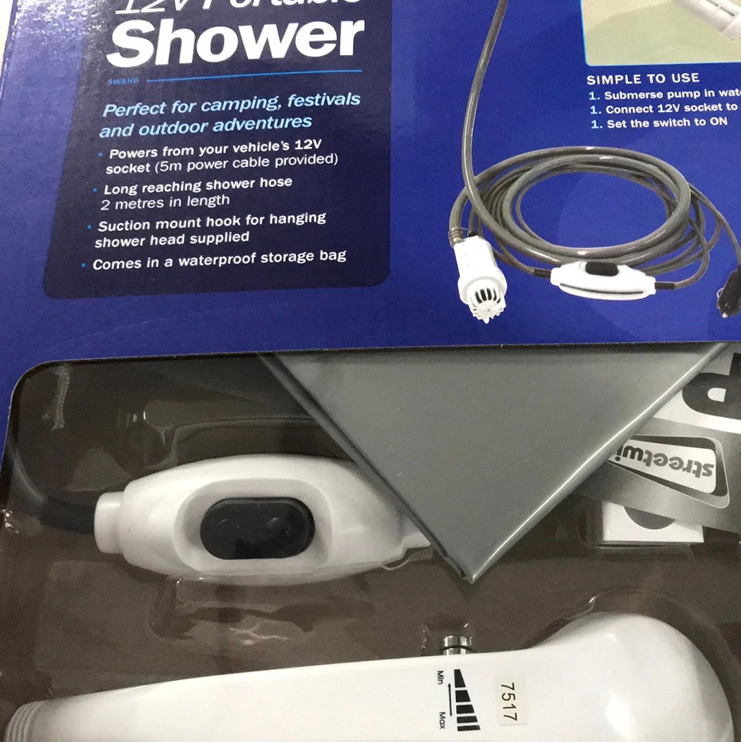 12volt portable shower with on off switch with carry bag and hanging fittings. Ideal for portable washing or filling up a motorhome water tank from a container