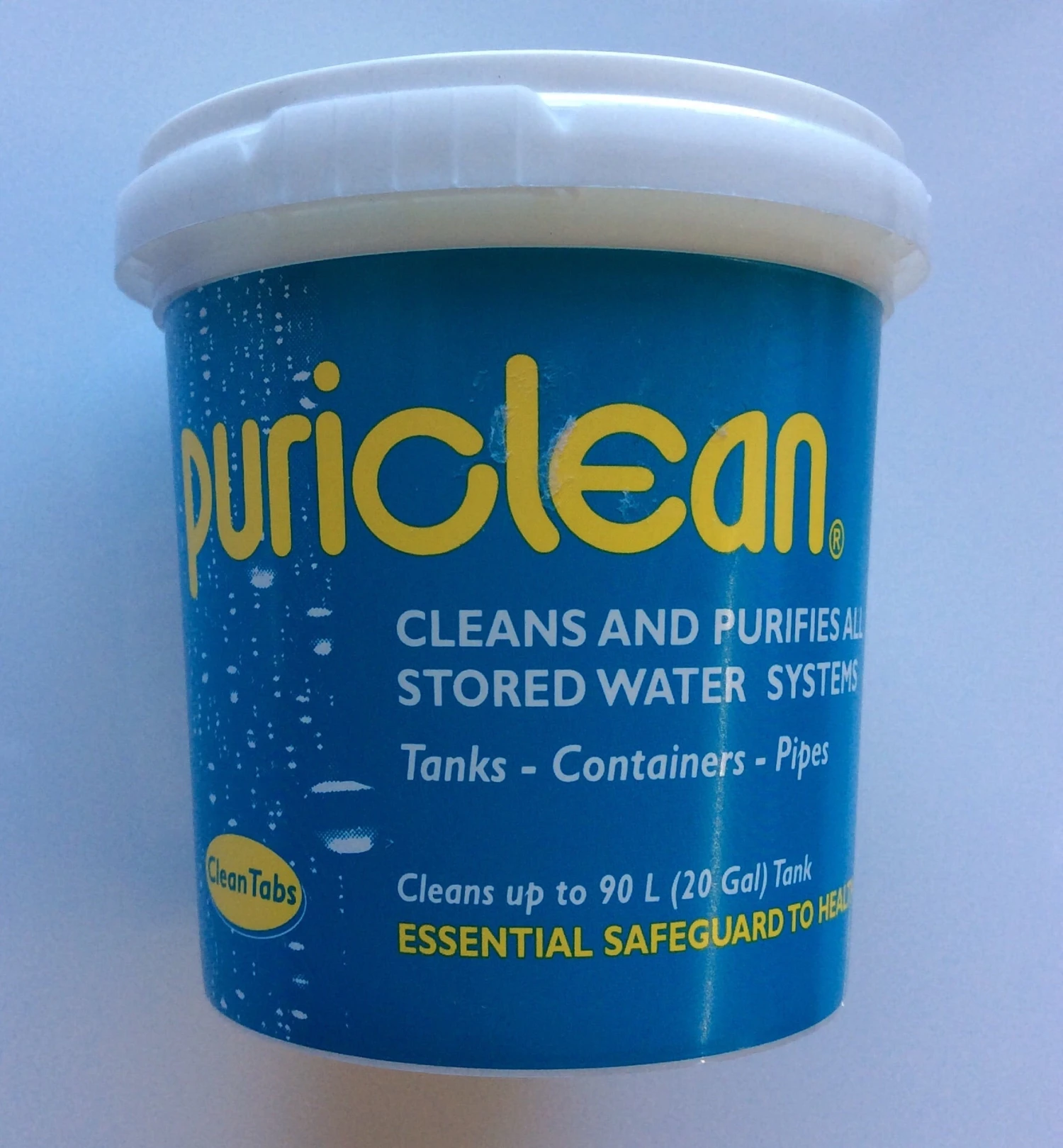 Puriclean 100g cleans and purifies stored water systems up to 90 litres or 20 gallons.