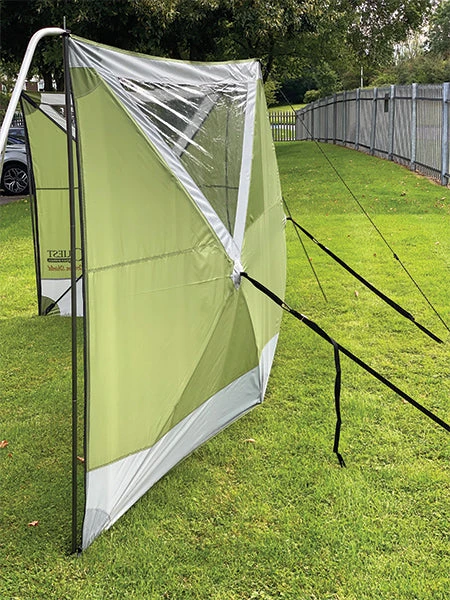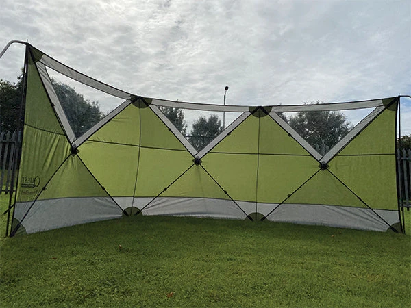 The Quest Screen Shield is a 3 panel windbreak system made to compliment the Quest Screen Houses. It can be attached directory to the Screen House Pro range via the accessory zip, or it can be used as a stand alone windbreak. An additional panel can be connected. The Screen Shield is also very tall and each panel has its own window, allowing you to see through the windbreak.
