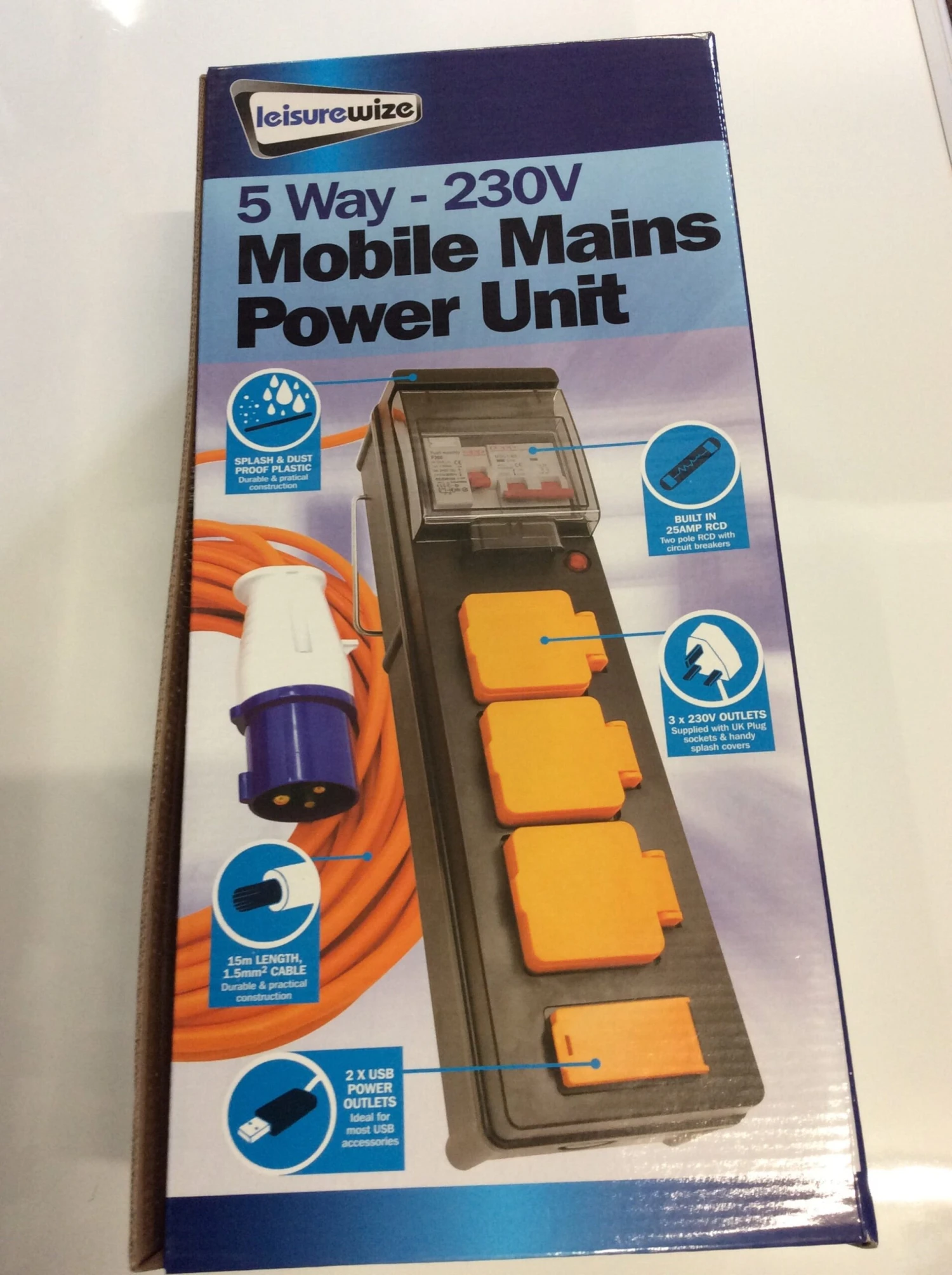 Mobile mains power unit with five power points, three 230v mains socket and two usb points on a 15mt cable