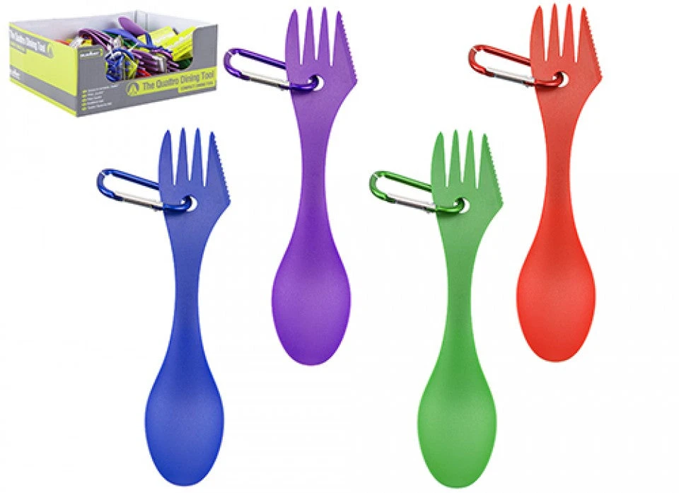This Ultimate space saving utensil combines a fork, spoon and serrated blade to meet the needs of the camper. Ideal for camping, hiking or fishing trips, this lightweight, hard-wearing utensil is compact and saves space in the rucksack. It comes with a handy carabiner to securely fasten it to rucksacks etc.