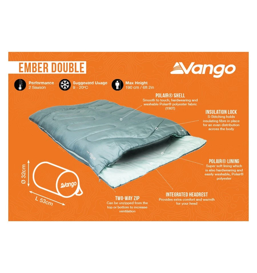 The Vango Ember Sleeping Bag is a fantastic valued square shaped double sleeping bag. The Ember bag has a 2 season rating and is constructed using quality fabrics and fills. Making it the ideal purchase for cost conscious family campers and festival goers.