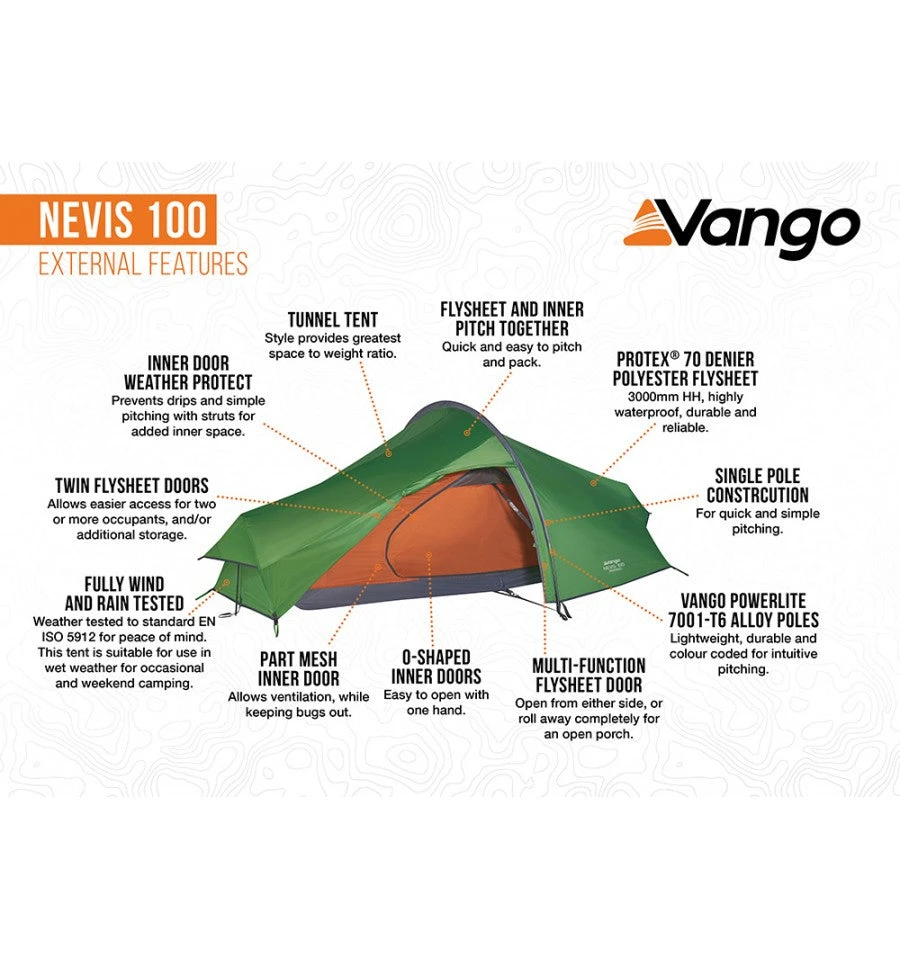 The Vango Nevis 100 is both a compact and lightweight, 1 man tent that can be easily carried when hiking. The Nevis 100 features Vango’s brilliant TBS®II straps which increase the tents performance in adverse conditions, especially in strong and changeable weather. The Nevis is a brilliant tent which offers good head height, for those getting started in exploring the great outdoors.