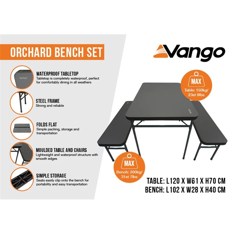 The Vango Orchard Bench Set is perfect for all outdoor occasions, from gardens to campsites. It includes 2x benches that seat up to 4 people in comfort and the sturdy steel frame ensures maximum reliability. It features an easy to clean surface, waterproof tabletop and fold flat design with the benches fitting inside the table and features a carry handle for easy transportation.