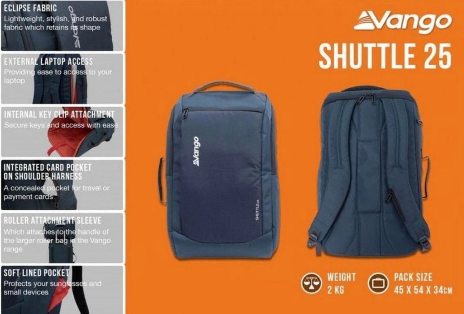 The Shuttle 25 from Vango has been designed as the perfect travel companion. Durable, lightweight and with a stylish minimalist design it is fully equipped with a series of useful features including a quick access to the main compartment, concealed front zip pocket, card pockets and A4 compatible for the storage of paperwork, laptops and other devices.