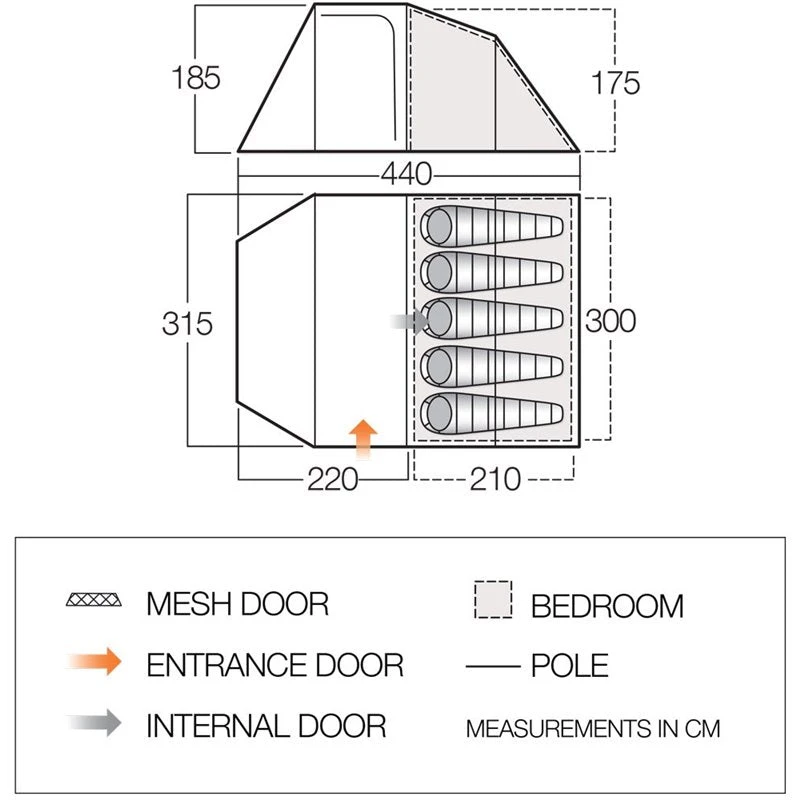 The Vango Skye 500 is a 5 man, 3 poled tunnel tent which is easy to pitch, great space to pack-size ratio and highly functional. The large porch is great for storing kit and features a linked-in groundsheet, which can be rolled under the bedroom area when not required. Clear side windows allow light into the porch area, whilst the Lights-Out bedroom reduces early morning light. This 5 man tent is the perfect festival tent.